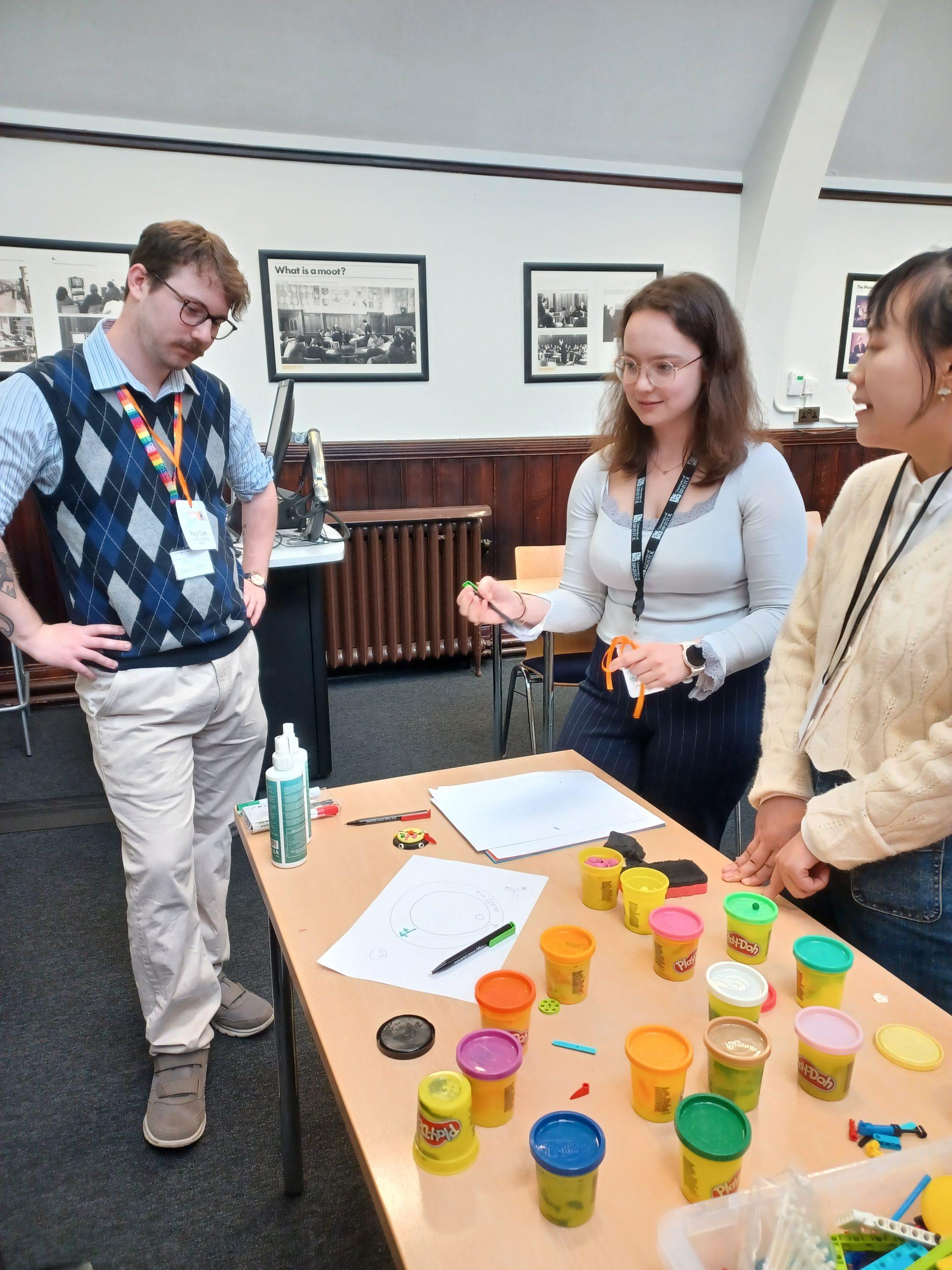 We started by providing participants with materials like Lego, plasticine, pens and paper and asked them to “design a prototype” in groups, providing little restraints on their ideas. We were surprised to see their methods of coming to a final design: there was little initial discussion on requirements, specification, or user groups. Instead, groups began with physically expressing their ideas by modelling designs and functions in 3D space with the materials they had, choosing to design “on the fly” by constantly iterating and adapting the overall prototype to change as their ideas developed. This allowed them to expand and reduce functionality quickly, and meant that in a short time they had an all-encompassing real-world representation of their design idea.